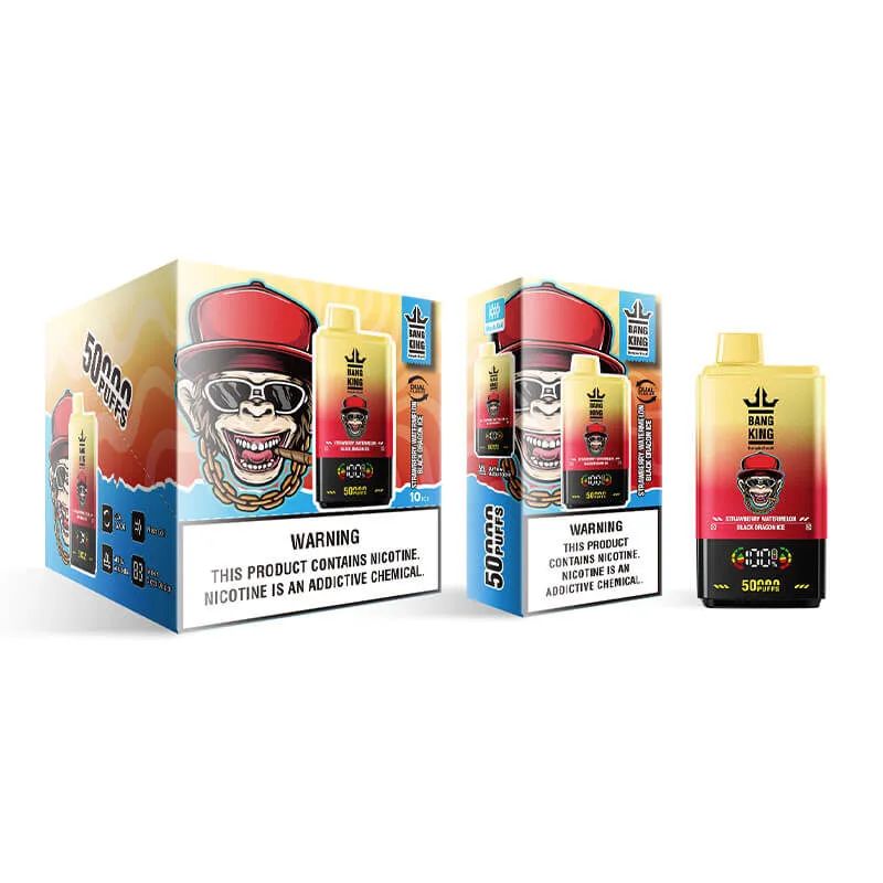 Bang King 50K combine une structure à double réservoir avec une interface LED qui affiche les niveaux de batterie et d'e-liquide restants. Un cœur de chauffe en maille permet une atomisation uniforme et un rendement stable. L'appareil prend en charge quatre taux de nicotine (0% / 2% / 3% / 5%) et un large catalogue d'arômes de la série des fruits.
