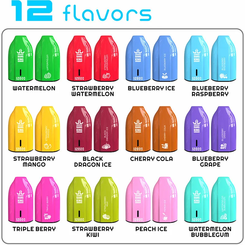 The Bang King 12000 delivers a compact, powerful, and flavor-forward disposable vape designed for users who want up to 12,000 puffs with smooth and consistent vapor output. With its 18mL e-liquid capacity, Mesh Coil, and Type-C quick charge, this model is ideal for everyday users and wholesale buyers seeking high turnover, strong flavor performance, and fast delivery.