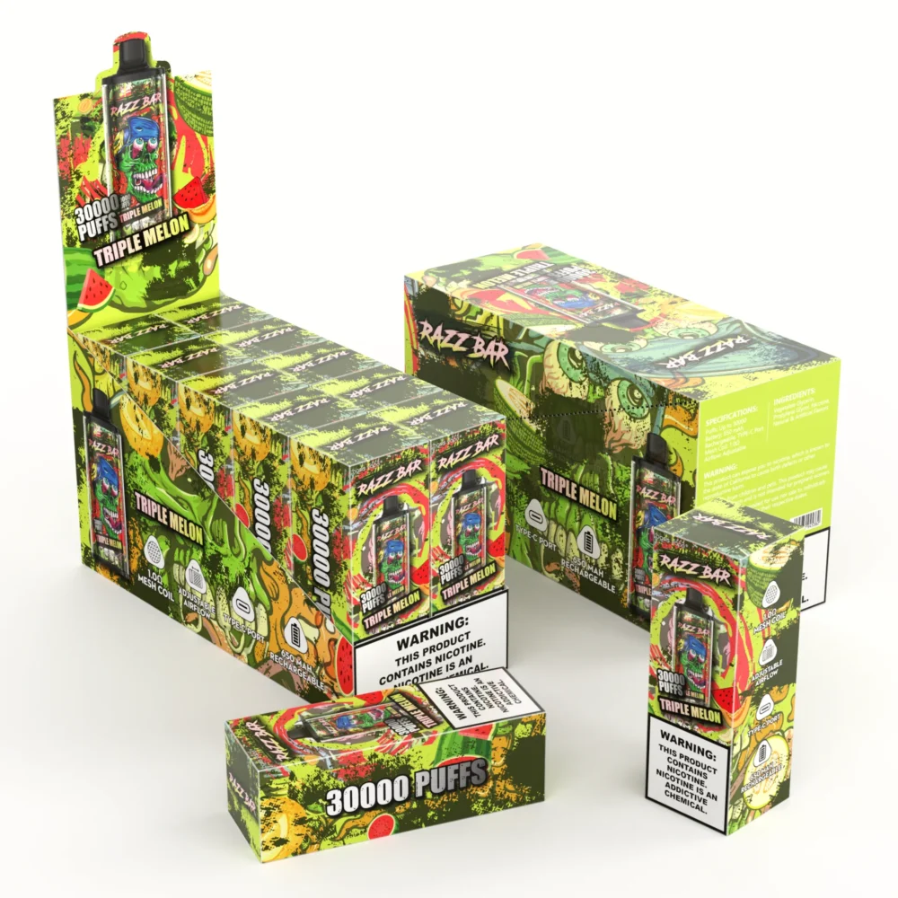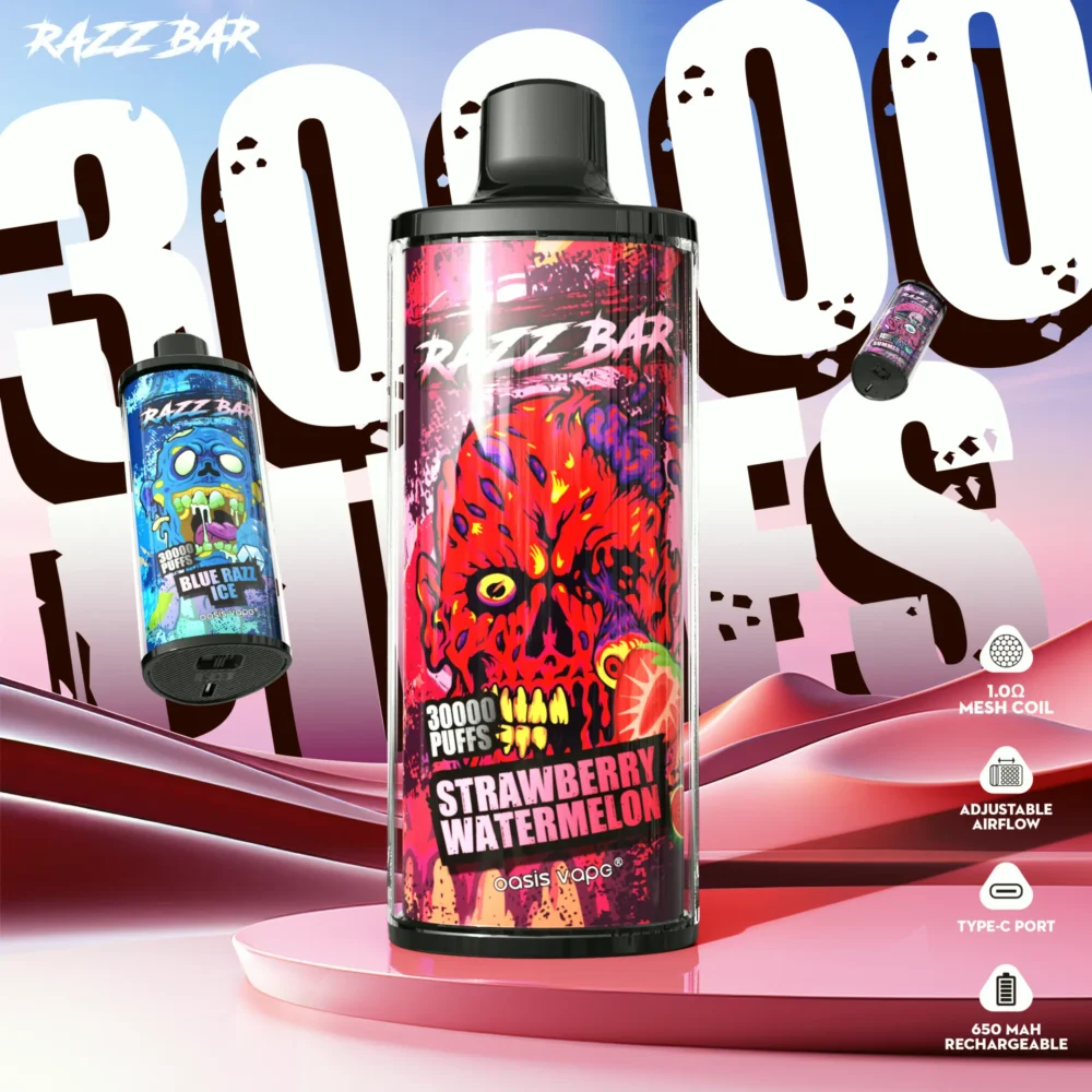 The Razz Bar 30000 is a pre-filled, USB-C rechargeable device with 1.0Ω mesh coil for clean flavor reproduction. The number of puffs is an indication only: the way you inhale, the air opening and the state of charge will greatly affect the duration.